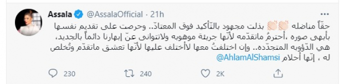 وغردت "أصالة"، عبر حسابها بـ"تويتر": حقاً مناضله بذلت مجهود بالتّأكيد فوق المعتاد، وحرصت على تقديم نفسها بأبهى صورة أحترم ما تقدمه لأنها جريئة موهوبة، ولا تتوانى عن ابهارنا دائما بالجديد، هي الدؤوبة المتجددة.. وإن اختلفت معها لا أختلف عليها لأنها تعشق ماتقدم وتخلص له، إنها أحلام".