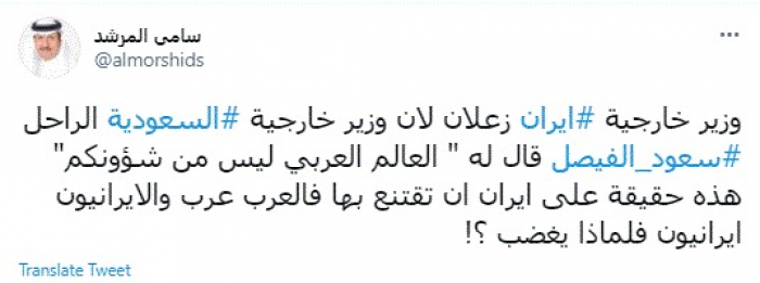 وكتب في تغريدة عبر "تويتر" رصدها "المشهد العربي": "وزير خارجية إيران زعلان لأن وزير خارجية السعودية الراحل سعود الفيصل قال له العالم العربي ليس من شؤونكم هذه حقيقة على إيران أن تقتنع بها فالعرب عرب والإيرانيون إيرانيون فلماذا يغضب".