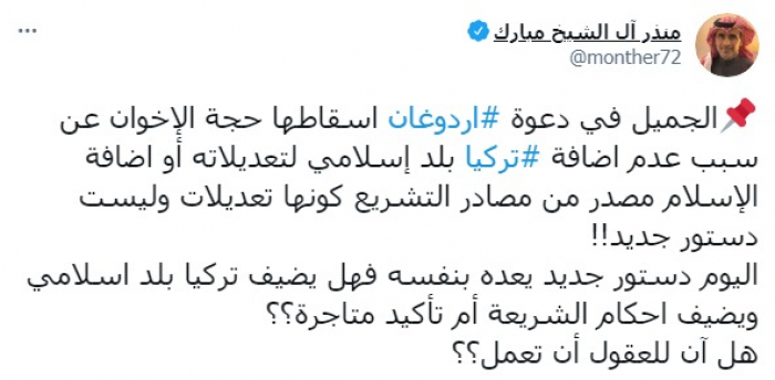 وقال في تغريدة على حسابه بموقع التدوين المصغر تويتر، اليوم إن: "الجميل في دعوة أردوغان، إسقاطها حجة الإخوان عن سبب عدم إضافة تركيا بلد إسلامي لتعديلاته أو اضافة الإسلام مصدر من مصادر التشريع كونها تعديلات وليست دستور جديد!!".