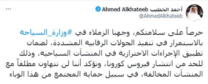 وقال في تغريدة على حسابه بموقع التدوين المصغر تويتر، اليوم إنه: "حرصاً على سلامتكم، وجهنا الزملاء في وزارة السياحة بالاستمرار في تنفيذ الجولات الرقابية المشددة".