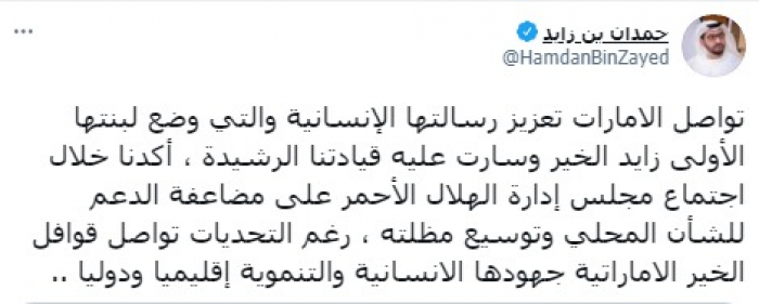وشدد في تغريدة على حسابه بموقع التدوين المصغر تويتر، على أنه: "تواصل الإمارات تعزيز رسالتها الإنسانية والتي وضع لبنتها الأولى زايد الخير وسارت عليه قيادتنا الرشيدة".