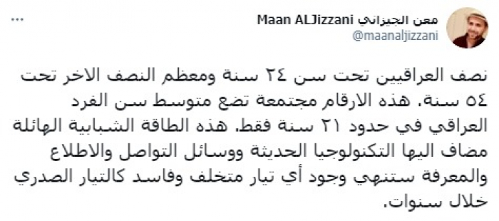 وقال في تغريدة على حسابه بموقع التدوين المصغر تويتر، اليوم إن: "نصف العراقيين تحت سن ٢٤ سنة ومعظم النصف الأخر تحت ٥٤ سنة، هذه الأرقام مجتمعة تضع متوسط سن الفرد العراقي في حدود ٢١ سنة فقط".