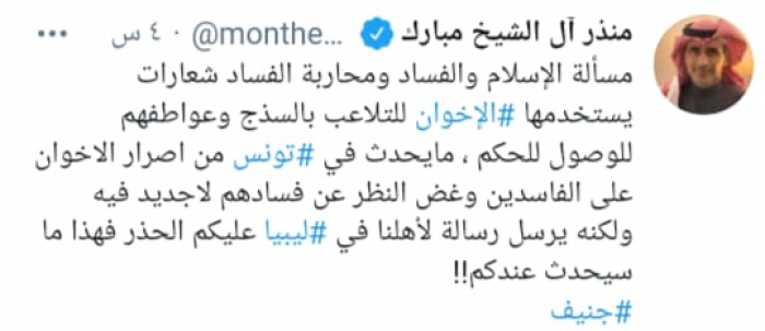 وأضاف أن "ما يحدث في تونس من إصرار الإخوان على الفاسدين، وغض النظر عن فسادهم لا جديد فيه، ولكنه يرسل رسالة لأهلنا في ليبيا عليكم الحذر فهذا ما سيحدث عندكم!!"