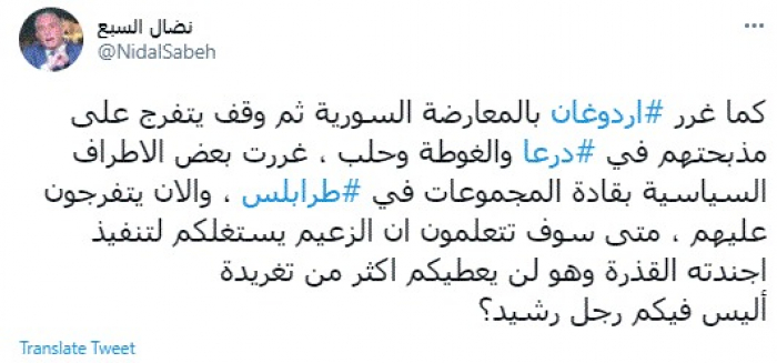 وقال في تغريدة عبر "تويتر" رصدها "المشهد العربي": "كما غرر أردوغان بالمعارضة السورية ثم وقف يتفرج على مذبحتهم في درعا والغوطة وحلب، غررت بعض الأطراف السياسية بقادة المجموعات في طرابلس، والآن يتفرجون عليهم".
