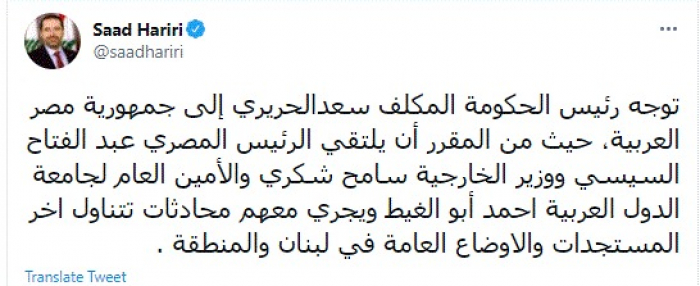 وقال في تغريدة عبر "تويتر" رصدها "المشهد العربي": "توجه رئيس الحكومة المكلف سعدالحريري إلى جمهورية مصر العربية، حيث من المقرر أن يلتقي الرئيس المصري عبد الفتاح السيسي ووزير الخارجية سامح شكري والأمين العام لجامعة الدول العربية أحمد أبو الغيط ويجري معهم محادثات تتناول آخر المستجدات والأوضاع العامة في لبنان والمنطقة".