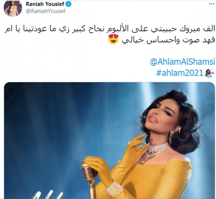 ونشرت رانيا صورة للمطربة أحلام، عبر حسابها الرسمي بموقع "تويتر"، وعلقت : "ألف مبروك حبيبتي على الألبوم، نجاح كبير زي ما عودتينا يا أم فهد، صوت وإحساس خيالي".