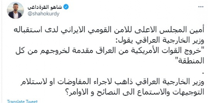 وقال في تغريدة عبر "تويتر" رصدها "المشهد العربي": "أمين المجلس الاعلى للامن القومي الايراني لدى استقباله وزير الخارجية العراقي يقول: خروج القوات الأمريكية من العراق مقدمة لخروجهم من كل المنطقة وزير الخارجية العراقي ذاهب لإجراء المفاوضات أو لاستلام التوجيهات والاستماع إلى النصائح والأوامر؟".