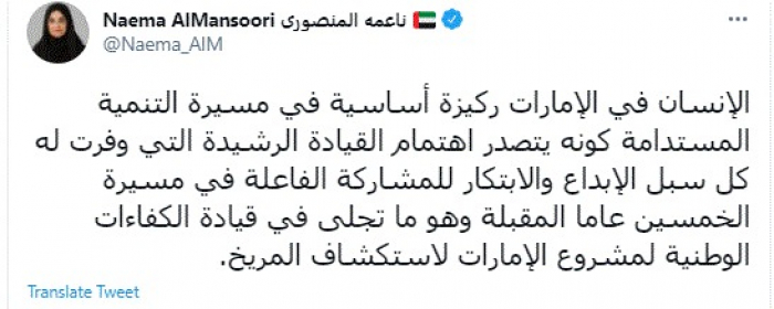 وكتبت في تغريدة عبر "تويتر" رصدها "المشهد العربي": "الإنسان في الإمارات ركيزة أساسية في مسيرة التنمية المستدامة كونه يتصدر اهتمام القيادة الرشيدة التي وفرت له كل سبل الإبداع والابتكار للمشاركة الفاعلة في مسيرة الخمسين عاما المقبلة وهو ما تجلى في قيادة الكفاءات الوطنية لمشروع الإمارات لاستكشاف المريخ".