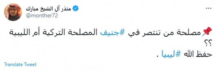 وقال في تغريدة عبر "تويتر" رصدها "المشهد العربي": "مصلحة من تنتصر في جنيف المصلحة التركية أم الليبية؟ حفظ الله ليبيا".