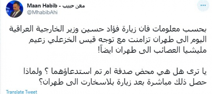 وقال في تغريدة عبر "تويتر" رصدها "المشهد العربي": "بحسب معلومات فان زيارة فؤاد حسين وزير الخارجية العراقية اليوم إلى طهران تزامنت مع توجه قيس الخزعلي زعيم مليشيا العصائب إلى طهران أيضاً يا ترى هل هي محض صدفة ام تم استدعاؤهما؟ ولماذا حصل ذلك مباشرة بعد زيارة بلاسخارت إلى طهران؟".