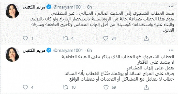وقالت في تغريدات عبر "تويتر" رصدها "المشهد العربي": "الخطاب الشعبوي هو الخطاب الذي يرتكز على التعبئة العاطفية لا يعتمد على الأفكار يعمل على إلهاب المشاعر يعزف على المزاج السائد أو يوهمك صُنّاع الخطاب بأنه السائد خطاب لا يتعامل مع المشاكل أو التحديات أو معطيات الواقع".