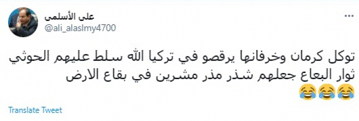وقال في تغريدة عبر "تويتر" رصدها "المشهد العربي": "توكل كرمان وخرفانها يرقصوا في تركيا الله سلط عليهم الحوثي ثوار البعاع جعلهم شذر مذر مشردين في بقاع الأرض".