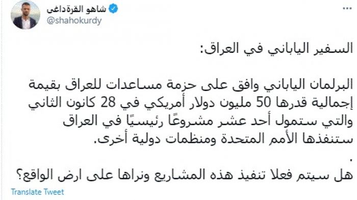 وقال في تغريدة عبر "تويتر" رصدها "المشهد العربي": "السفير الياباني في العراق: البرلمان الياباني وافق على حزمة مساعدات للعراق بقيمة إجمالية قدرها 50 مليون دولار أمريكي في 28 كانون الثاني والتي ستمول أحد عشر مشروعًا رئيسيًا في العراق ستنفذها الأمم المتحدة ومنظمات دولية أخرى. هل سيتم فعلا تنفيذ هذه المشاريع ونراها على أرض الواقع؟".