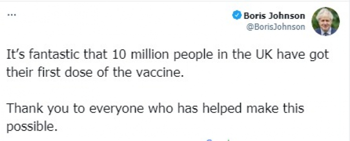 وقال في تغريدة على حسابه بموقع التدوين المصغر تويتر، اليوم إنه: "لأمر رائع أن 10 ملايين شخص في المملكة المتحدة قد حصلوا على جرعتهم الأولى من اللقاح".