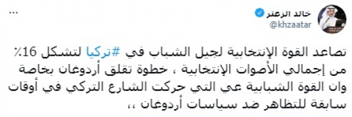 وشدد في تغريدة على حسابه بموقع التدوين المصغر تويتر، اليوم على أن: "تصاعد القوة الإنتخابية لجيل الشباب في تركيا لتشكل 16٪ من إجمالي الأصوات الانتخابية، خطوة تقلق أردوغان".