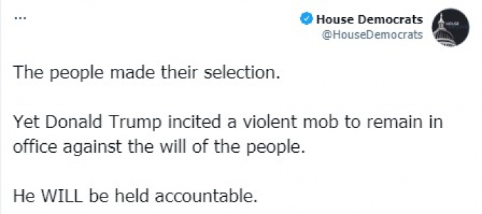 وقال في تغريدة على حسابه بموقع التدوين المصغر تويتر اليوم إن: "قام الناس باختيارهم، ومع ذلك، حرض دونالد ترامب حشودًا عنيفة على البقاء في منصبه ضد إرادة الشعب"، متعهدا: "سوف يخضع للمحاسبة".