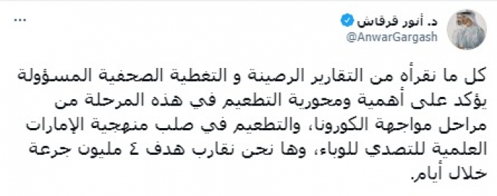 وأشار إلى أن: "التطعيم في صلب منهجية الإمارات العلمية للتصدي للوباء، وها نحن نقارب هدف ٤ مليون جرعة خلال أيام".