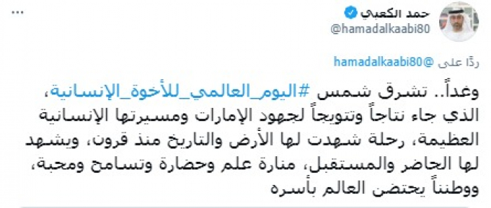 وأوضح في تغريدة على حسابه بموقع التدوين المصغر تويتر، اليوم أنه: "غدا.. تشرق شمس اليوم العالمي للأخوة الإنسانية، الذي جاء نتاجا وتتويجا لجهود الإمارات ومسيرتها الإنسانية العظيمة".