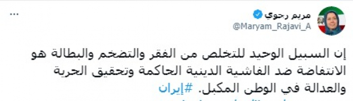 ورأت في تغريدة على حسابها بموقع التدوين المصغر تويتر، اليوم أن: "السبيل الوحيد للتخلص من الفقر والتضخم والبطالة هو الانتفاضة ضد الفاشية الدينية الحاكمة وتحقيق الحرية والعدالة في الوطن المكبل إيران".