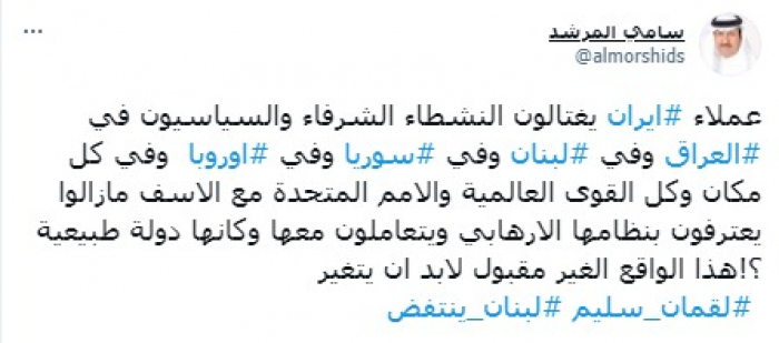 ندد المحلل السياسي السعودي سامي المرشد بتصاعد جرائم عملاء إيران في لبنان وسوريا والعراق وأوروبا، عبر اغتيال الناشطين السياسيين المعارضين لمليشياتها.