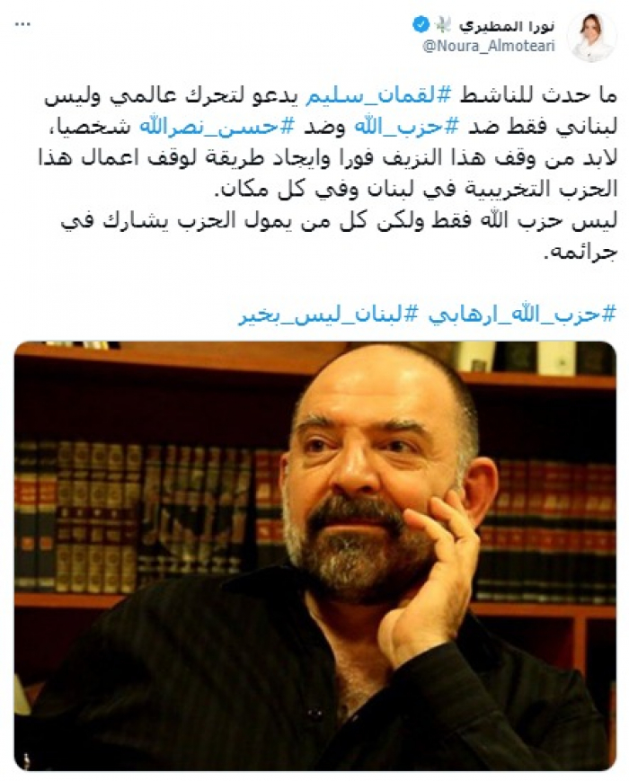 طالبت الإعلامية نورا المطيري بتحرك عالمي ضد مليشيات حزب الله المدعومة من إيران بعد اغتيال الناشط السياسي لقمان سليم، المعارض للمليشيات.