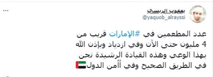 وأشار في تغريدة على حسابه بموقع التدوين المصغر تويتر، اليوم إلى أن: "عدد المطعمين في الإمارات قريب من 4 مليون حتى الآن وفي ازدياد".