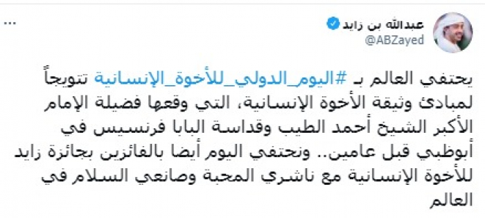 وأوضح في تغريدة على حسابه بموقع التدوين المصغر تويتر، اليوم أنه: "يحتفي العالم باليوم الدولي للأخوة الإنسانية، تتويجاً لمبادئ وثيقة الأخوة الإنسانية، التي وقعها فضيلة الإمام الأكبر الشيخ أحمد الطيب وقداسة البابا فرنسيس في أبوظبي قبل عامين".
