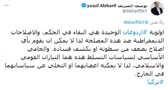 الشريف: أردوغان لن يقبل بإصلاحات تكشف فساده