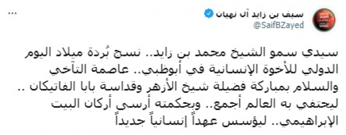 وشدد في تغريدة على حسابه بموقع التدوين المصغر تويتر، اليوم على أن: "سيدي سمو الشيخ محمد بن زايد، نسج بُردة ميلاد اليوم الدولي للأخوة الإنسانية في أبوظبي، عاصمة التآخي والسلام بمباركة فضيلة شيخ الأزهر وقداسة بابا الفاتيكان".