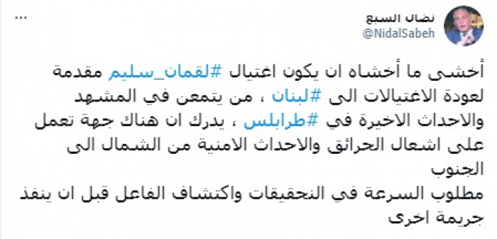 عبر المحلل السياسي نضال السبع عن قلقه من موجة اغتيالات في لبنان، عقب اغتيال الناشط السياسي المعارض لمليشيات حزب الله المدعومة من إيران لقمان سليم.
