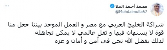 وقال في تغريدة على حسابه بموقع التدوين المصغر تويتر، اليوم إن: "شراكة الخليج العربي مع مصر والعمل الموحد بيننا جعل منا قوة لا يستهان فيها و ثقل عالمي لا يمكن تجاهله".