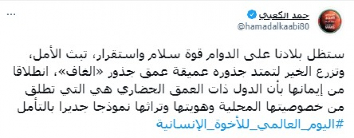 وأضاف: "انطلاقا من إيمانها بأن الدول ذات العمق الحضاري هي التي تطلق من خصوصيتها المحلية وهويتها وتراثها نموذجا جديرا بالتأمل"، مختتما بهاشتاج: "اليوم العالمي للأخوة الإنسانية".