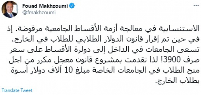 وقال في تغريدة عبر "تويتر" رصدها "المشهد العربي": "الاستنسابية في معالجة أزمة الأقساط الجامعية مرفوضة. إذ في حين تم إقرار قانون الدولار الطلابي للطلاب في الخارج، تسعى الجامعات في الداخل إلى دولرة الأقساط على سعر صرف 3900! لذا تقدمت بمشروع قانون معجل مكرر من أجل منح الطلاب في الجامعات الخاصة مبلغ 10 آلاف دولار أسوة بطلاب الخارج".