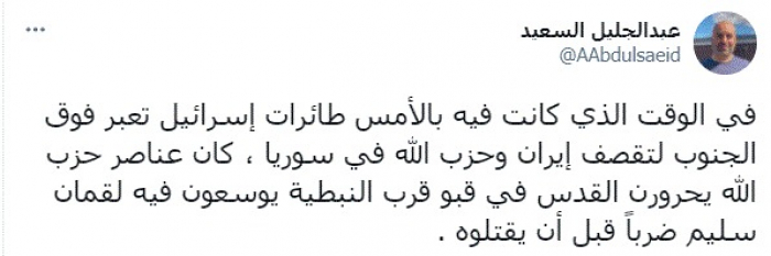 وقال في تغريدة عبر "تويتر" رصدها "المشهد العربي": "في الوقت الذي كانت فيه بالأمس طائرات إسرائيل تعبر فوق الجنوب لتقصف إيران وحزب الله في سوريا، كان عناصر حزب الله يحرورن القدس في قبو قرب النبطية يوسعون فيه لقمان سليم ضرباً قبل أن يقتلوه".