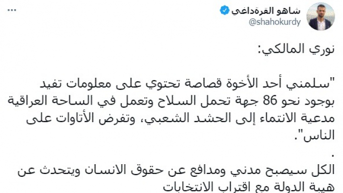 وقال في تغريدة عبر "تويتر" رصدها "المشهد العربي": "نوري المالكي: سلمني أحد الأخوة قصاصة تحتوي على معلومات تفيد بوجود نحو 86 جهة تحمل السلاح وتعمل في الساحة العراقية مدعية الانتماء إلى الحشد الشعبي، وتفرض الأتاوات على الناس.. الكل سيصبح مدني ومدافع عن حقوق الإنسان ويتحدث عن هيبة الدولة مع اقتراب الانتخابات".