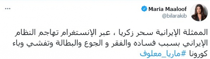 وقالت في تغريدة عبر "تويتر" رصدها "المشهد العربي": "الممثلة الإيرانية سحر زكريا، عبر الإنستغرام تهاجم النظام الإيراني بسبب فساده والفقر والجوع والبطالة وتفشي وباء كورونا".