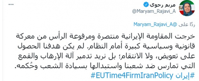 وكتبت في تغريدة عبر "تويتر" رصدها "المشهد العربي": "خرجت المقاومة الإيرانية منتصرة ومرفوعة الرأس من معركة قانونية وسياسية كبيرة أمام النظام. لم يكن هدفنا الحصول على تعويض، ولا الانتقام؛ بل نريد تدمير آلة الإرهاب والقمع التي تمارس ضد شعبنا واستبدالها بسيادة الشعب وحُكمه".