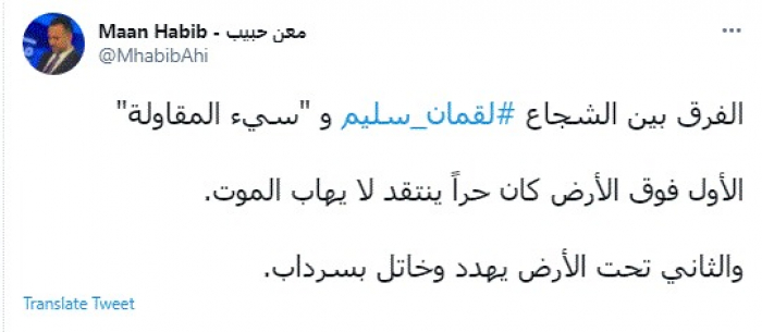 وقال في تغريدة عبر "تويتر" رصدها "المشهد العربي": "الفرق بين الشجاع لقمان سليم وسيء المقاولة الأول فوق الأرض كان حراً ينتقد لا يهاب الموت. والثاني تحت الأرض يهدد وخاتل بسرداب".