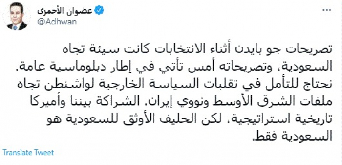 وكتب في تغريدة عبر "تويتر" رصدها "المشهد العربي": "تصريحات جو بايدن أثناء الانتخابات كانت سيئة تجاه السعودية، وتصريحاته أمس تأتي في إطار دبلوماسية عامة. نحتاج للتأمل في تقلبات السياسة الخارجية لواشنطن تجاه ملفات الشرق الأوسط ونووي إيران".