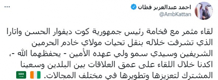 وقال في تغريدة عبر "تويتر" رصدها "المشهد العربي": "لقاء مثمر مع فخامة رئيس جمهورية كوت ديفوار الحسن واتارا الذي تشرفت خلاله بنقل تحيات مولاي خادم الحرمين الشريفين وسيدي سمو ولي عهده الأمين - يحفظهما الله -، اكدنا خلال اللقاء على عمق العلاقات بين البلدين وسعينا المشترك لتعزيزها وتطويرها في مختلف المجالات".