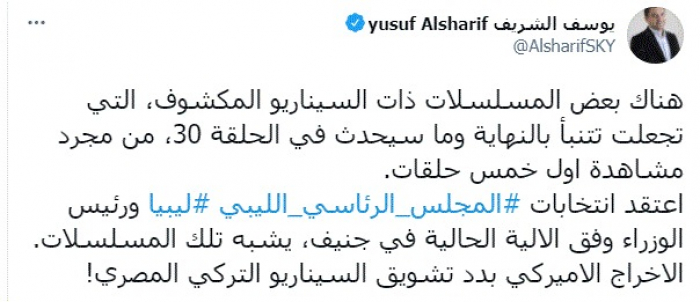 وأضاف:اعتقد انتخابات المجلس الرئاسي الليبي ليبيا ورئيس الوزراء وفق الالية الحالية في جنيف، يشبه تلك المسلسلات. الإخراج الاميركي بدد تشويق السيناريو التركي المصري".