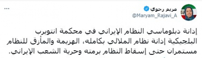 وقالت في تغريدة على حسابها بموقع التدوين المصغر تويتر، اليوم إن: "إدانة دبلوماسي النظام الإيراني في محكمة انتويرب البلجیکیة إدانة نظام الملالي بکامله".