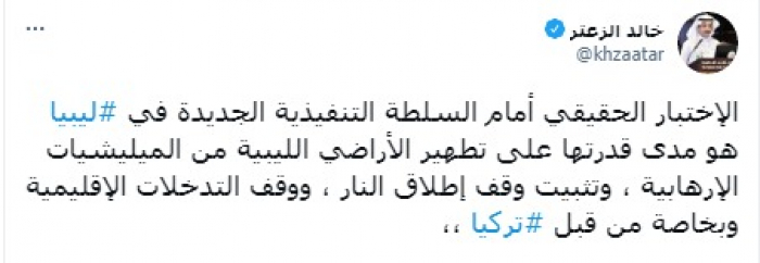 ورأى في تغريدة على حسابه بموقع التدوين المصغر تويتر، اليوم أن: "الاختبار الحقيقي أمام السلطة التنفيذية الجديدة في ليبيا هو مدى قدرتها على تطهير الأراضي الليبية من المليشيات الإرهابية، وتثبيت وقف إطلاق النار، ووقف التدخلات الإقليمية وبخاصة من قبل تركيا".