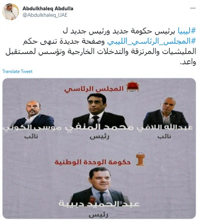 وقال في تغريدة عبر "تويتر" رصدها "المشهد العربي": "ليبيا برئيس حكومة جديد ورئيس جديد للمجلس الرئاسي الليبي وصفحة جديدة تنهى حكم المليشيات والمرتزقة والتدخلات الخارجية وتؤسس لمستقبل واعد".