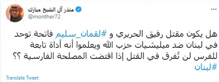 وقال في تغريدة عبر "تويتر" رصدها "المشهد العربي": "هل يكون مقتل رفيق الحريري ولقمان سليم فاتحة توحد في لبنان ضد مليشيات حزب الله ويعلموا أنه أداة تابعة للفرس لن تُفرق في القتل إذا اقتضت المصلحة الفارسية؟".