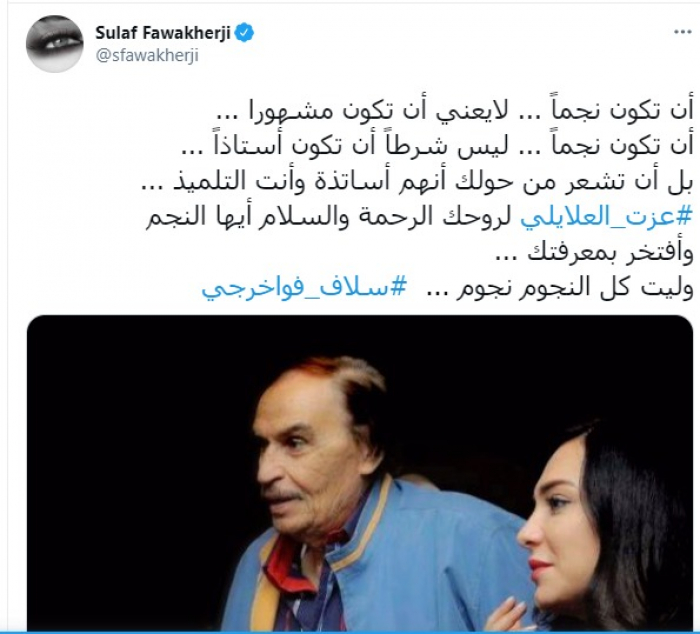 وأضافت: "عزت العلايلي.. لروحك الرحمة والسلام أيها النجم، وأفتخر بمعرفتك.. وليت كل النجوم نجوم".