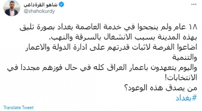 وقال في تغريدة عبر "تويتر" رصدها "المشهد العربي": "18 عام ولم ينجحوا في خدمة العاصمة بغداد بصورة تليق بهذه المدينة بسبب الانشغال بالسرقة والنهب. أضاعوا الفرصة لإثبات قدرتهم على إدارة الدولة والأعمار والتنمية".