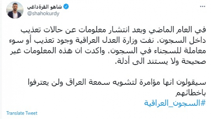 وقال في تغريدة عبر "تويتر" رصدها "المشهد العربي": "في العام الماضي وبعد انتشار معلومات عن حالات تعذيب داخل السجون، نفت وزارة العدل العراقية وجود تعذيب أو سوء معاملة للسجناء في السجون، واكدت ان هذه المعلومات ﻏﻴﺮ صحيحة وﻻ ﻳﺴﺘﻨﺪ اﻟﻰ أدﻟﺔ. سيقولون إنها مؤامرة لتشويه سمعة العراق ولن يعترفوا بأخطائهم".