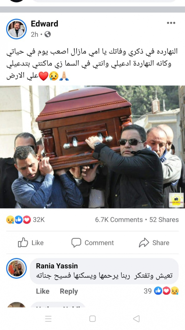 نشر إدوارد صورة من جنازة والدته، عبر حسابه الرسمي بموقع "فيس بوك"، علق :" النهارده في ذكرى وفاتك يا أمي مازال أصعب يوم في حياتي وكانه النهاردة ادعيلي وانتي في السما زي ماكنتي بتدعيلي على الأرض".