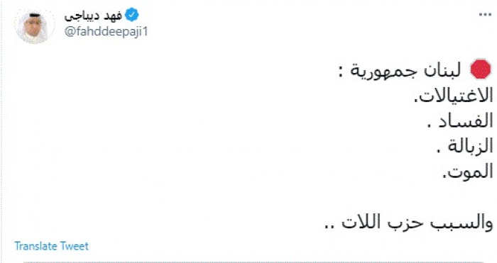 قال المحلل السياسي السعودي فهد ديباجي، اليوم، إن حزب الله حول لبنان إلى جمهورية الاغتيالات والفساد والموت.